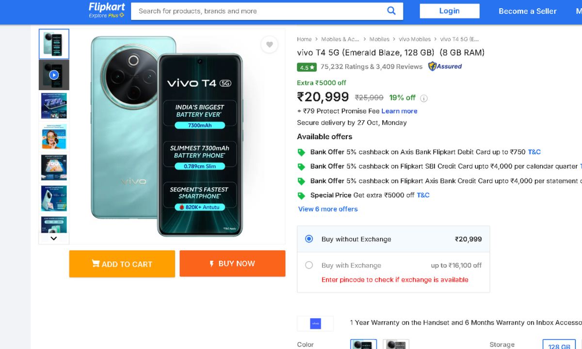 Flipkart Sale 2025: Are you trying to find a 5G phone for less than ₹20,000? A great option is the Vivo T4 5G. Flipkart is selling it for just under ₹20,000. It has a great camera and a 7300mAh battery. Certain bank cards may come with discounts and exchange chances. It has a Snapdragon processor and a 6.77-inch screen.