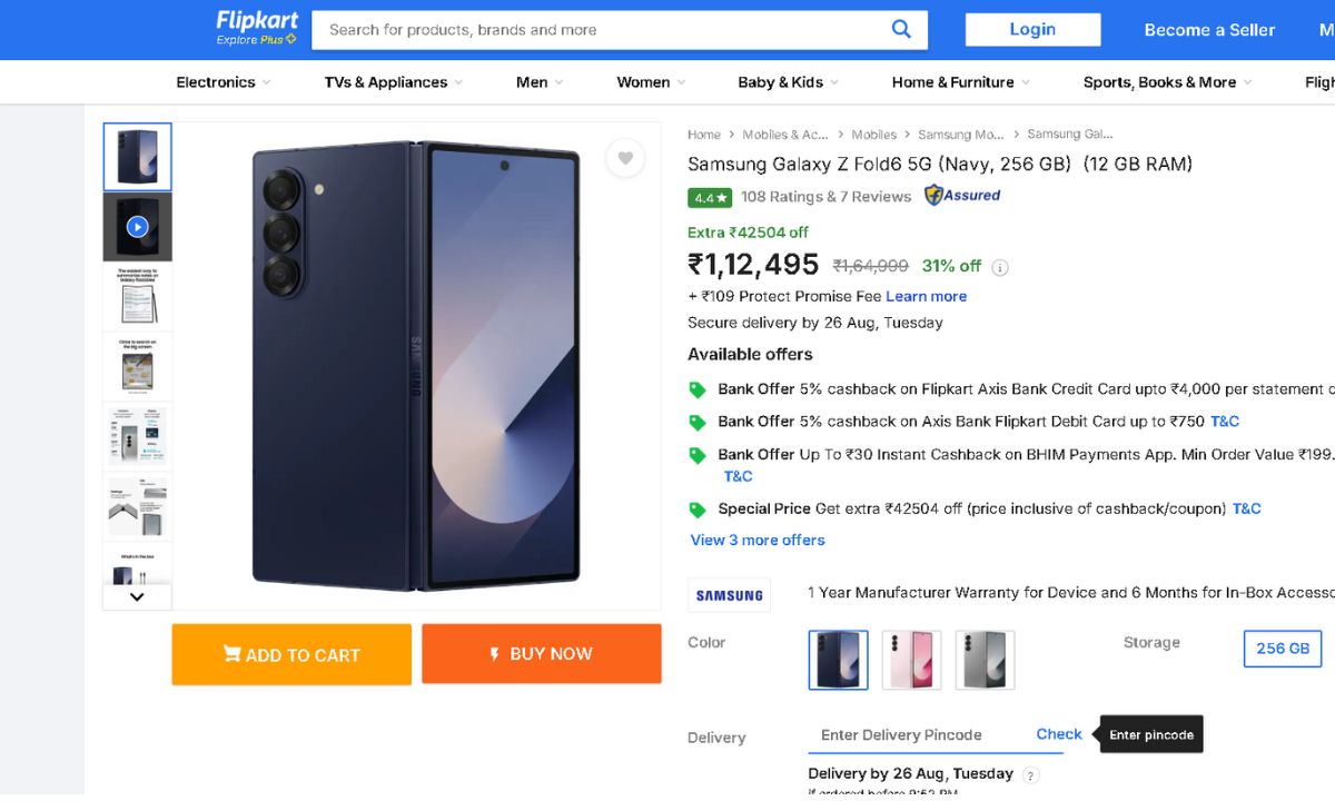 Flipkart Today Deal: Discount on Samsung Galaxy Z Fold 6: Originally priced at Rs 1,64,999, this phone is now under Rs 1,10,000. Let us learn about this foldable phone’s features and current sales.