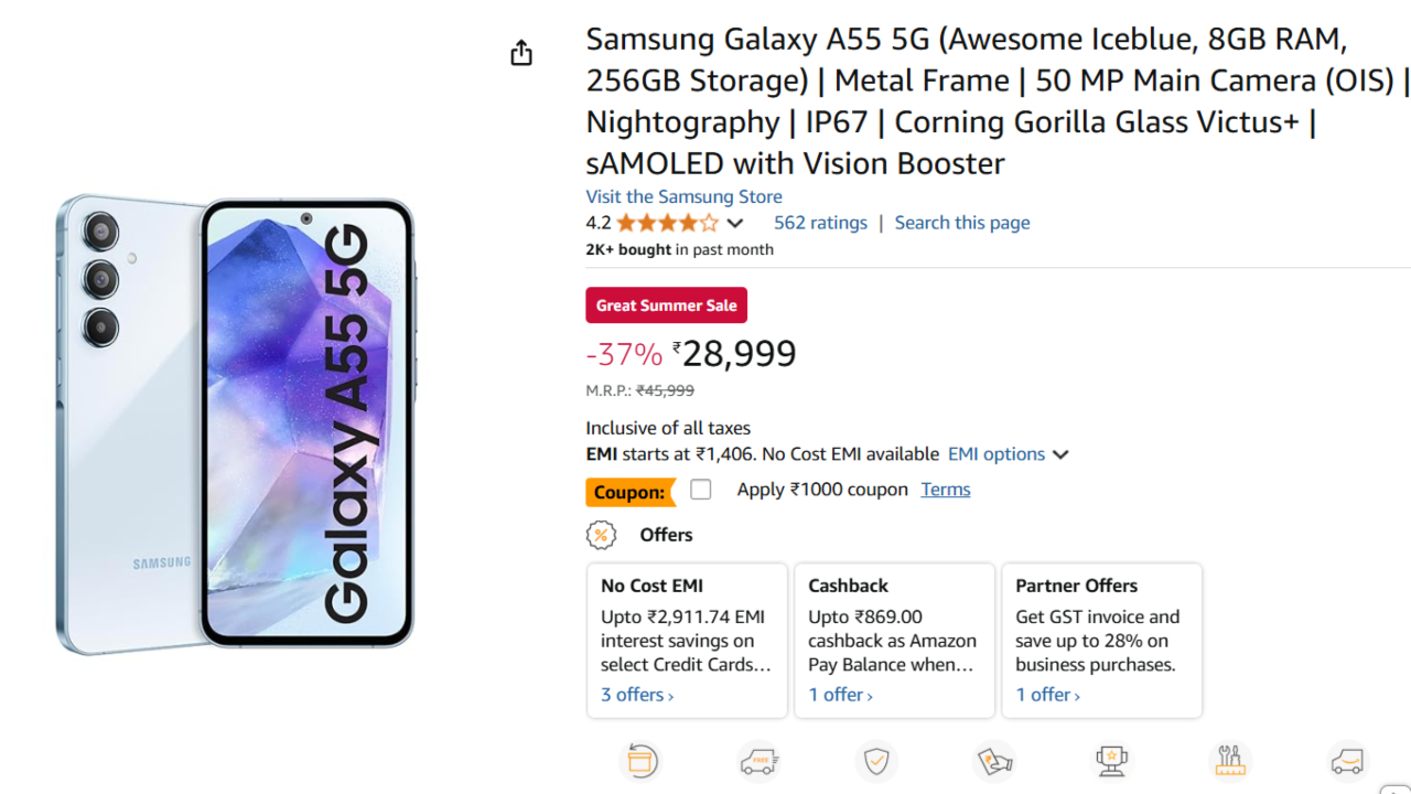 Samsung Galaxy A55 5G Offers : If you are thinking of buying a new smartphone, then this could be the perfect moment. Samsung Galaxy A55 5G is currently on Amazon at an astonishing discount. This is one such rare deal that crops up. And the most intriguing part? You can even pay instalments in small installments month after month.
