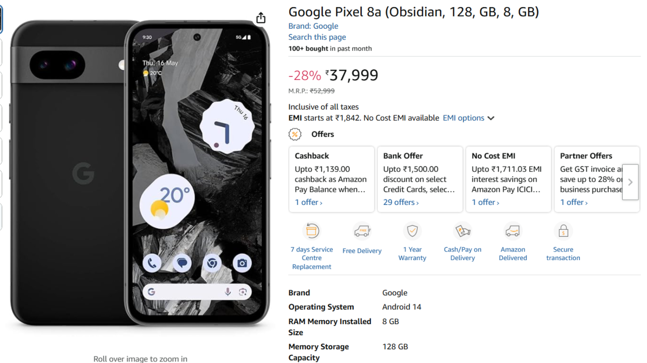 Pixel 8a costs ₹52,999. Amazon is putting it on festival offer at ₹37,999, though. That’s ₹15,000 less all at once. That kind of discount doesn’t happen that easily. Zero-cost EMI option is available, otherwise, though. That is, the price can be paid in installments in small amounts monthly without paying an additional fee.