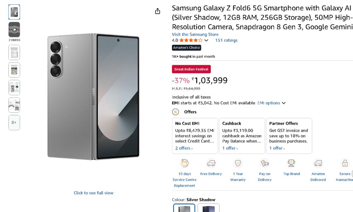 To make this offer even better, you can use an Amazon ICICI Bank credit card to receive an extra ₹3,119 in cashback for this phone. You can buy the phone for about ₹1 lakh with this deal. Silver Shadow and Navy Blue are the two-color options available for the phone.