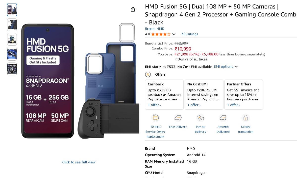 HMD Fusion 5G: This phone prices at ₹10,999 on Amazon and has a 50-megapixel selfie camera as well to its 108-megapixel primary camera. Also, the company offers a RAM extension function that improves its overall RAM from 8GB to 16GB.