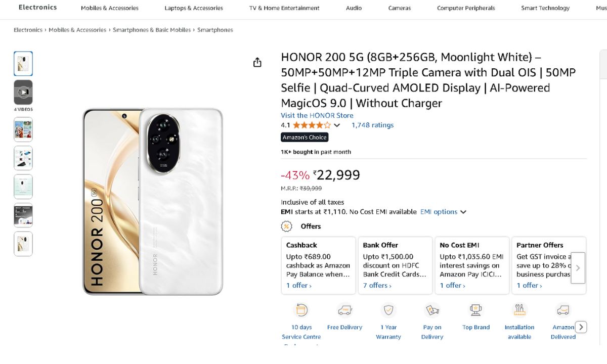 The Honor 200 5G is available on the online retailer Amazon for Rs 22,999. In addition to this price reduction, you can receive a discount of up to Rs 1500 when you pay with credit cards from specific banks. Depending on the model and condition of the old phone, users can receive big exchange discounts when exchanging it if they so choose. The phone is available for purchase in both black and white.