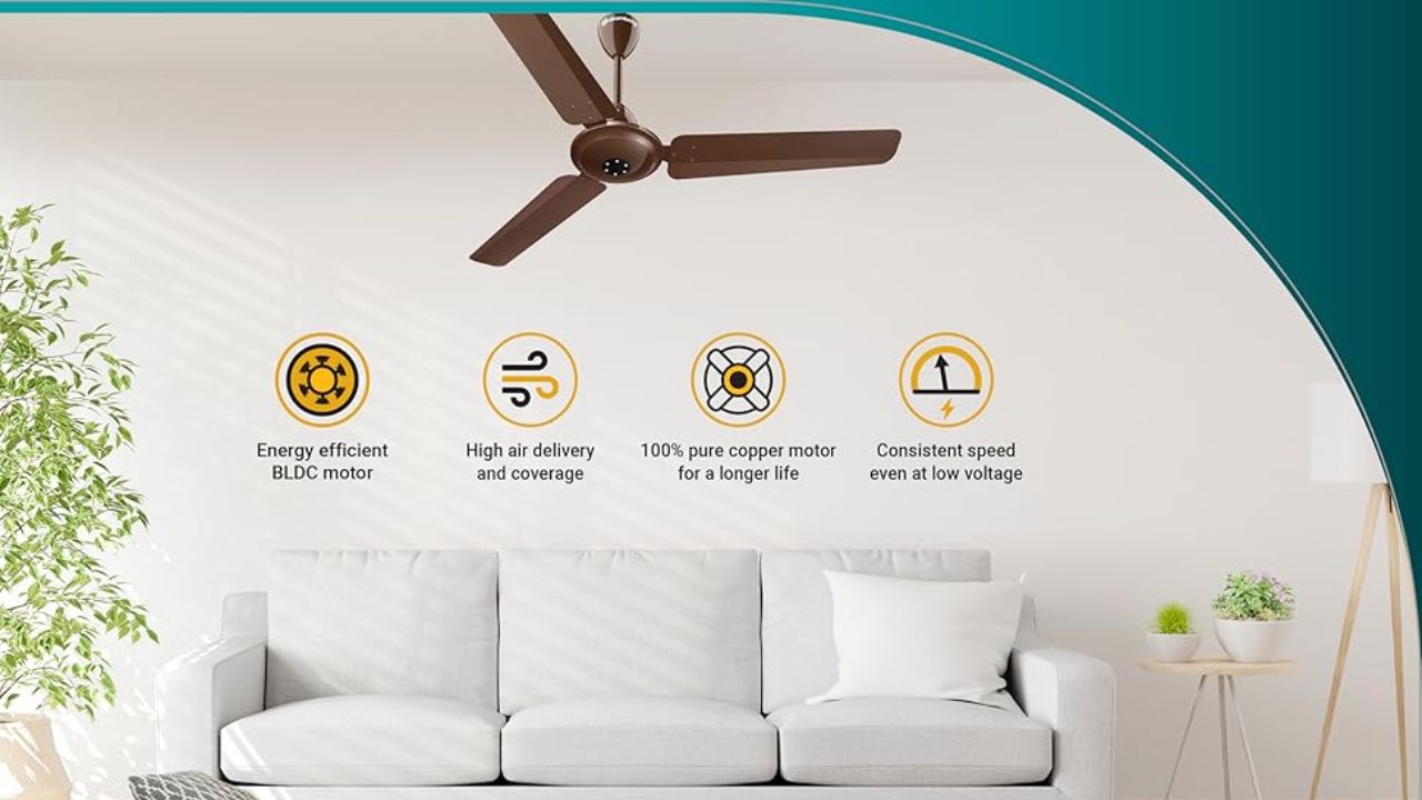 Atomberg Efficio Alpha has a high air delivery of 230 CMM at 365 RPM speed using only 28W of power. The fan’s IR remote lets users remotely control speed, boost mode, sleep mode, and timers without pairing. Its powder-coated glossy finish with an LED speed indicator adds room style. Its speed is also constant, even when there are voltage fluctuations between 165V and 285V. On an inverter, it lasts three times longer than normal fans. It has a 1+1 year warranty, and a doorstep installation facility is available from Urban Company. Available for ₹2,699, it’s an affordable option with new-age features.