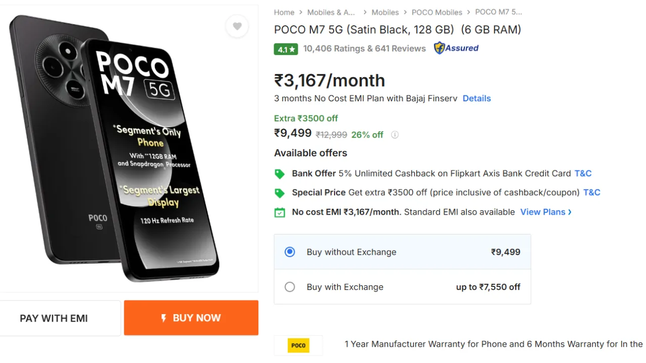 There is also an EMI at zero cost. That is, you can buy the phone today and pay for the phone later in instalments without shelling out an extra penny. If you already possess a phone, you can even trade-in your phone and get a discount of up to ₹8,500 depending upon your phone model and the status of your phone. In that manner, you will be able to buy the Poco M7 5G at a very low cost.