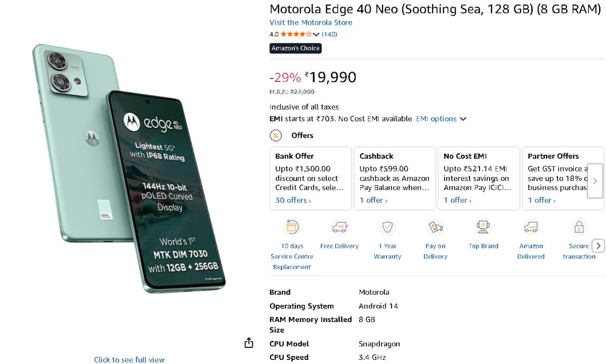 The Motorola device is initially priced at ₹27,999, but after a flat discount of over 30 percent, it is available on Amazon for ₹19,990. Also, payments made with specific bank cards are eligible for an extra discount of up to ₹1,500, which further reduces the effective price.