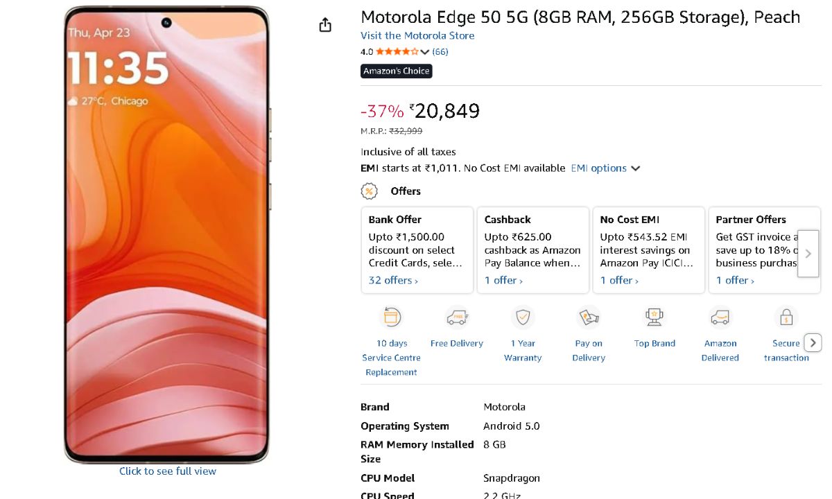 Amazon has the Motorola Edge 50 model with 8GB RAM and 256GB storage for ₹20,850. In terms of bank offers, payments made with a DBS Bank credit card are eligible for an instant 7.5 percent discount (up to ₹1500), which reduces the effective price to ₹19,350. This phone was offered at a discount of ₹8,649 when it was first released in August 2024 for ₹27,999. Also, there is a ₹19,650 exchange offer. However, the type and condition of the smartphone being turned in decide the exchange offer’s greatest benefit.