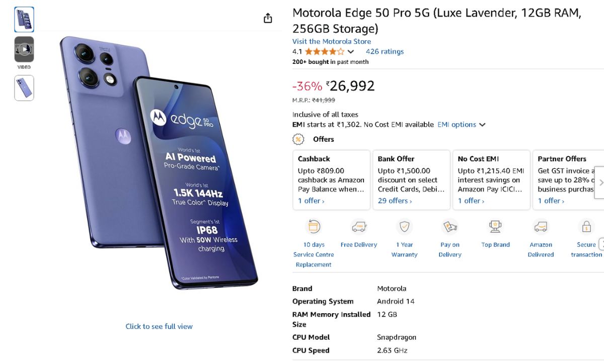 The Motorola Edge 50 Pro, the company’s flagship phone with underwater protection, is now cheaper than it was when it was first released. The phone model with 12 GB of RAM and 256 GB of internal storage priced Rs 35999 when it was first released. Currently, Amazon India is selling this phone model for Rs 26,994, which is around 9,000 rupees lower. Until September 10, a flat discount of up to Rs 1,000 is also available over the phone. Also, you can buy this phone and receive up to Rs 1349 in cashback.