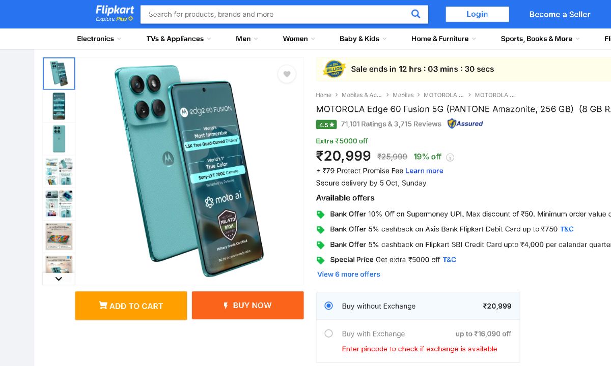 At launch, the Motorola Edge 60 Fusion priced ₹22,999. However, after a ₹2,000 reduction, it is currently available for ₹20,999 on Flipkart’s BBD sale. The price will be lowered by the ₹2,000 discount and a bank discount.