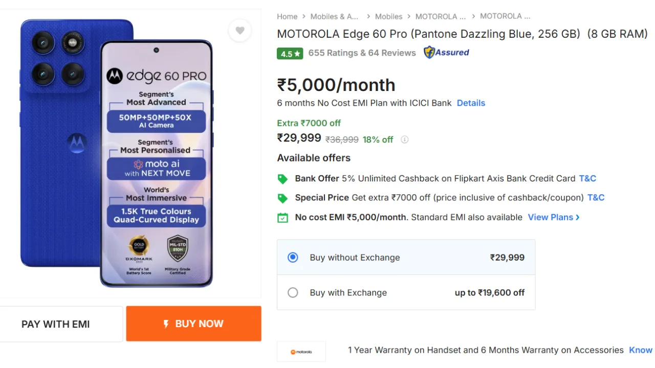 Motorola Edge 60 Pro Offer : If you were holding on to purchase a high-end smartphone at an affordable price, now is the time. Motorola Edge 60 Pro is now available at a lower price on Flipkart. The phone that used to cost 36,999 can now be purchased as cheap as 29,999. That is, you are saving around 18 percent on the cost price. And the icing on the cake is that there is also a no cost EMI facility. So, you can pay through instalments without paying any additional fee.