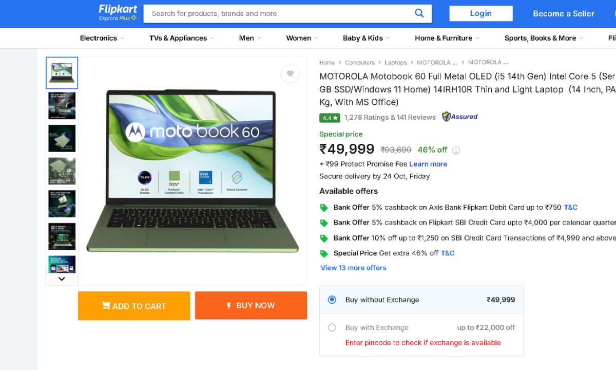 MOTOROLA Motobook 60: Motorola confirmed that the laptop will start at ₹39,990 during the Flipkart Big Bang Diwali Sale on its social media site, X. Flipkart is selling the 16GB+512GB model with an i5 processor for ₹49,999. It priced ₹70,000 when it was first released.