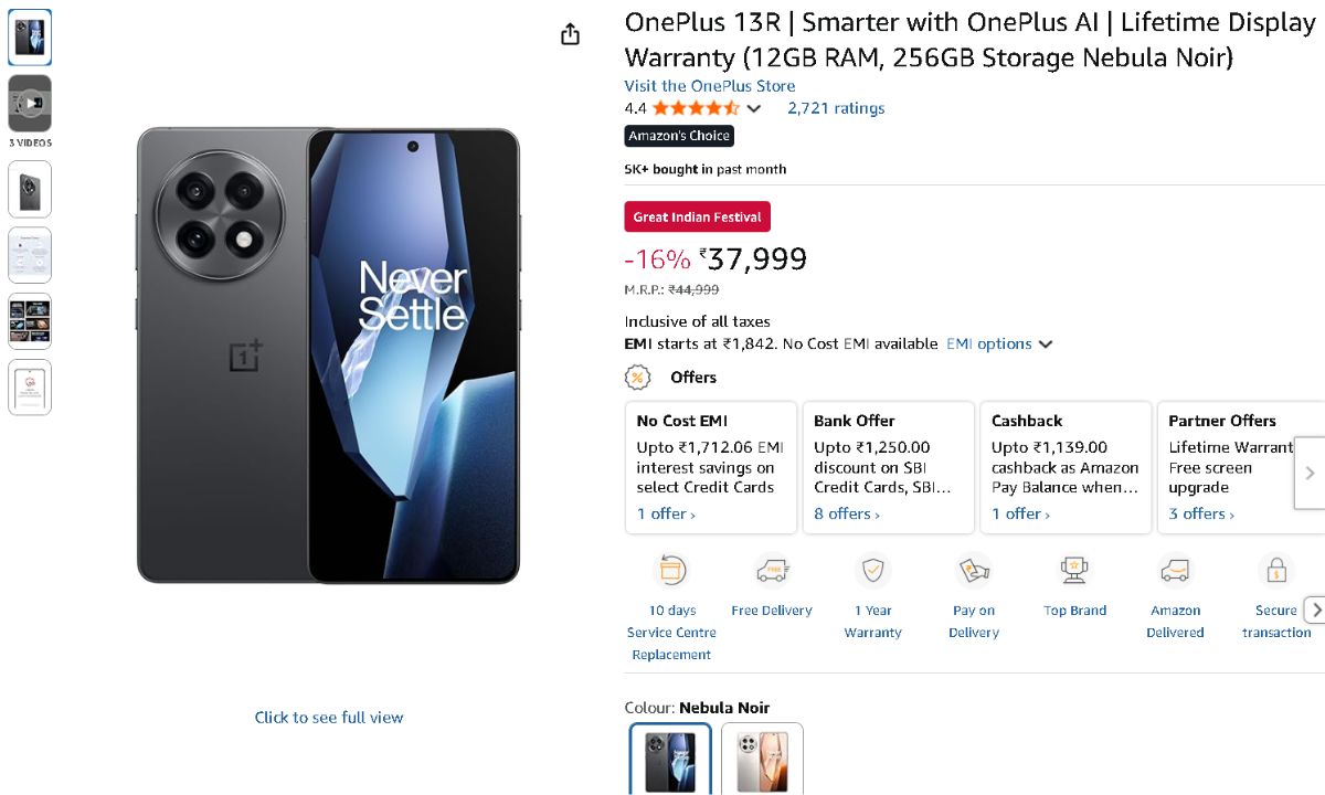 The 12GB RAM/256GB storage model of the OnePlus 13R 5G prices ₹37,999 on Amazon. For payments made with an SBI credit or debit card, the bank is offering a discount of up to ₹2,000, which lowers the effective price to ₹35,999. Additionally, you can save up to ₹36,000 by exchanging in your old smartphone. But the type and present state of the gadget being traded determine the offer’s maximum advantage. Due to its January 2025 launch price of Rs 42,999, this smartphone is currently available at around Rs 7,0000 less.
