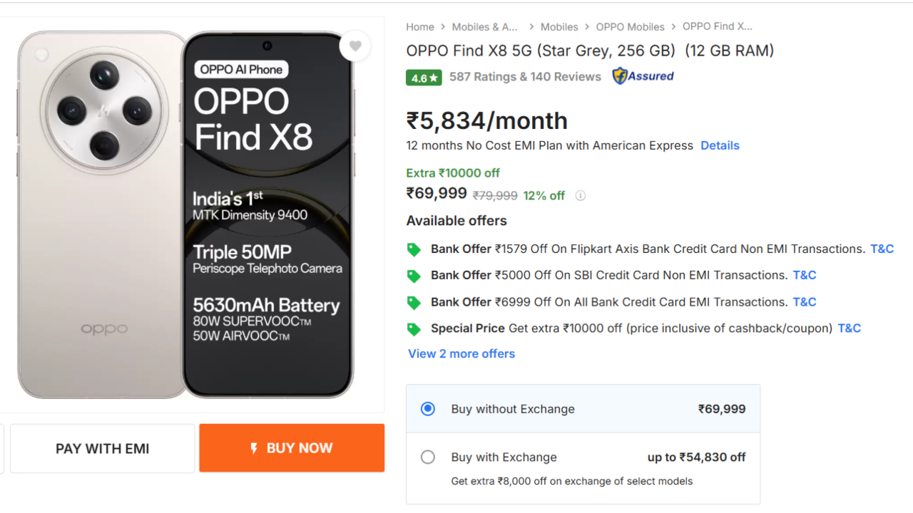 The OPPO Find X8 is now at a special launch price of only Rs 69,999, originally priced at Rs 79,999. You can also avail a 12-month no-cost EMI option, making it light on your pocket. There’s more: receive an exchange offer of up to Rs 54,830, an additional Rs 500 discount on an SBI credit card, and a Rs 5,730 discount on the no-cost EMI option. With so many options to save, this is the best time to take home this high-end smartphone without feeling the pinch.
