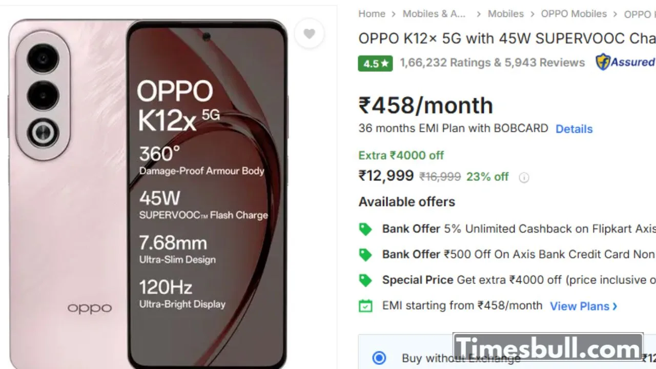 The MRP of OPPO K12x 5G was ₹ 16,999, but on Flipkart you can buy it for ₹ 12,999. Along with this, you are getting an additional discount of ₹ 4000, which makes it even more attractive. Apart from this, many bank offers and EMI options are also available, through which you can buy it even more easily.