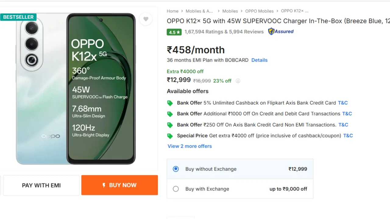 Oppo K12x 5G Discount : If you’ve been holding on to buy a new smartphone, today could be the day to do that. Flipkart is offering a fantastic deal on the Oppo K12x 5G, and it’s also extremely affordable to buy at the moment as well. The phone was once priced at Rs. 16,999, but you can now buy it from just Rs. 12,999. That’s a pure 23% discount. But hold on.