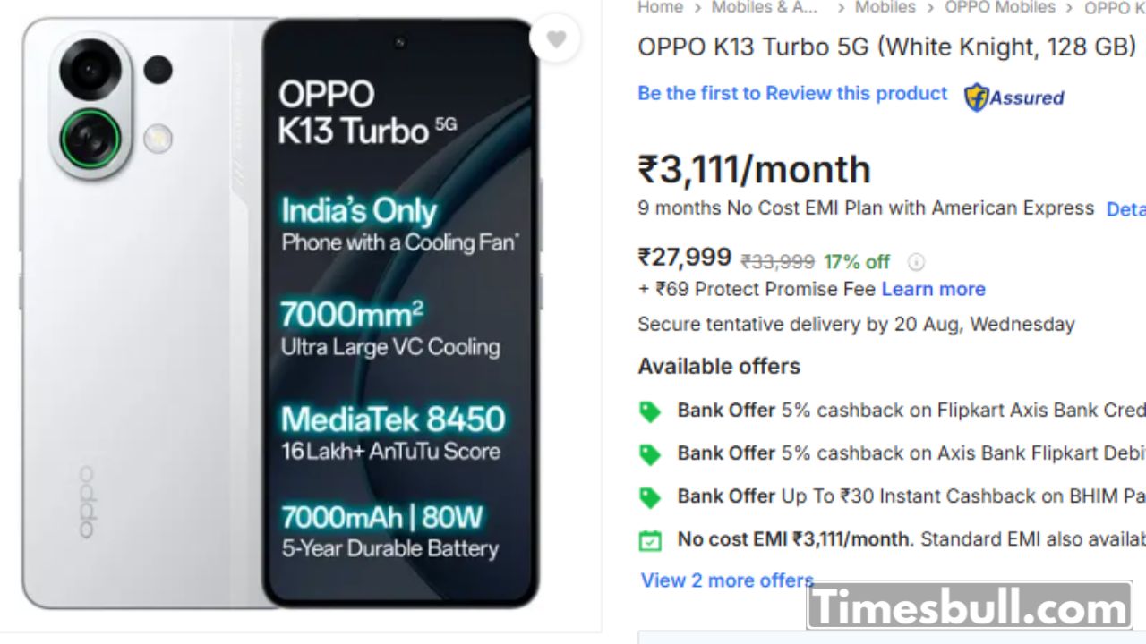 OPPO K13 Turbo 5G: There is great news for smartphone lovers. OPPO has launched its high-performance phone, the OPPO K13 Turbo 5G, with a limited-time offer on Flipkart. Earlier its price was ₹33,999, but now you can get it for just ₹27,999. This offer is not just limited to discount, No-Cost EMI options are also available on Flipkart, which makes buying the phone even easier. If you order now, you will get this powerhouse phone in just a few days, by 20 August 2025.