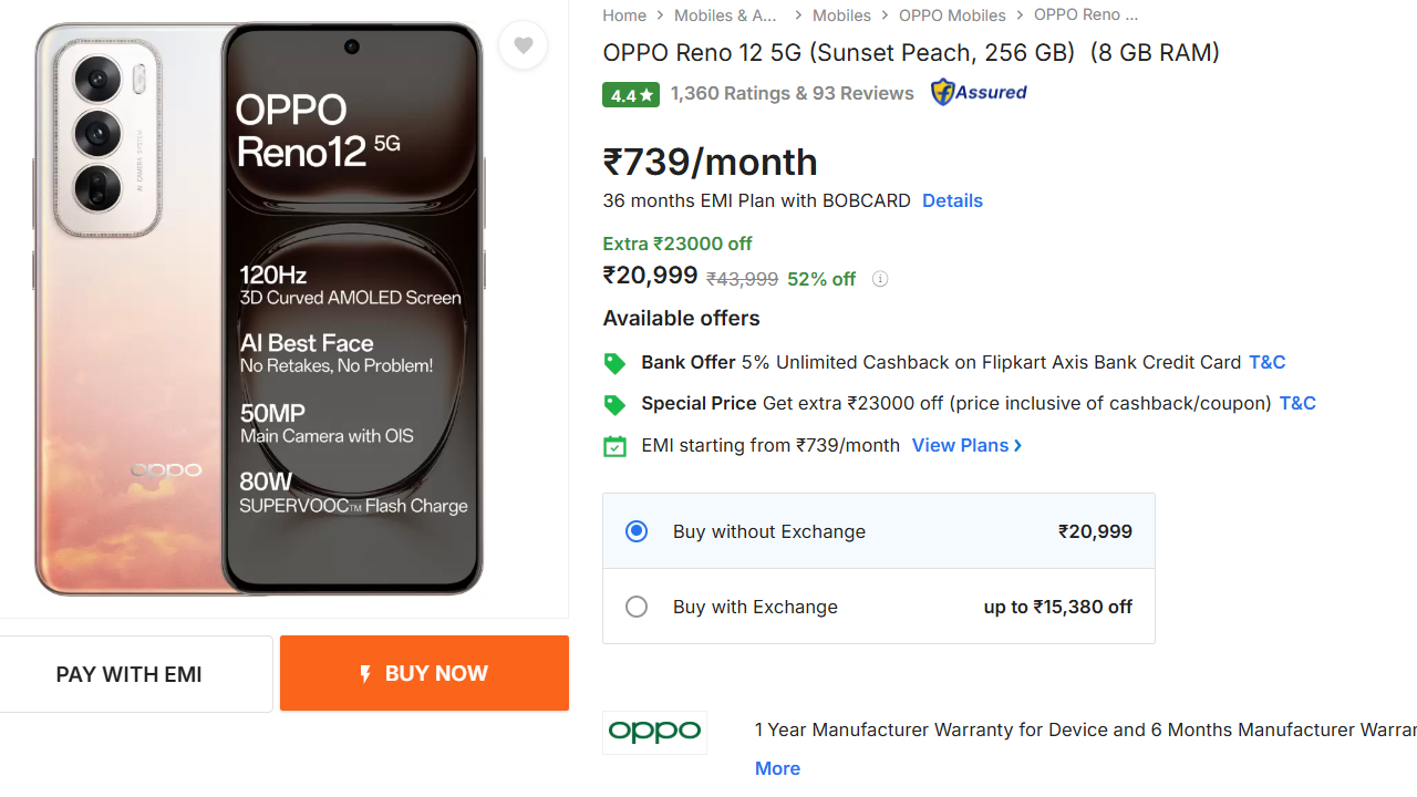 The Oppo Reno 12 5G was launched in India alongside the Reno 12 Pro, priced at Rs 32,999. It came in Astro Silver, Matte Brown, and Sunset Peach colours. Currently, it is listed on Flipkart for Rs 20,999, and with additional offers, it can be yours for just Rs 19,999 a straight discount of Rs 13,000.