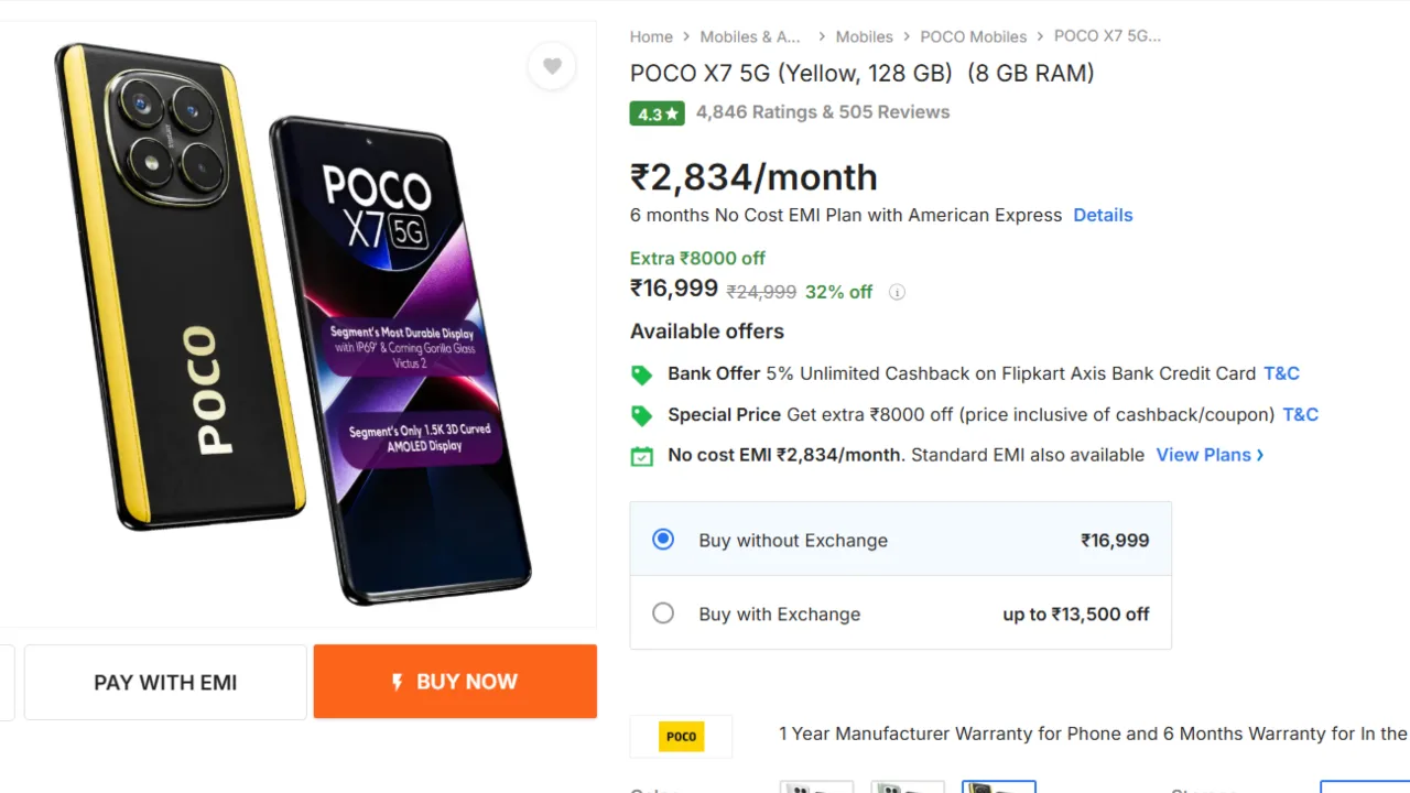 Poco X7 5G Deal : Do you want a budget phone with all these features? Poco X7 5G is on sale today at a bargain price on Flipkart. It originally priced at 24,999 but today you can take it for a offer of 16,999. That is 32 percent off, which is making this deal quite great. And if you also wish to pay the price installment-wise, there is even no cost EMI. So, you can simply buy it without shelling out an additional amount of money.
