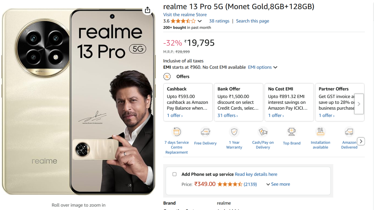 Even though the Realme 13 Pro 5G originally costs ₹28,999, you can acquire it for ₹19,795 by taking a discount of 32% on it. Also, you even have the privilege to get zero-cost EMI offers between ₹960/month and exchange offers based on a minimum of ₹18,550. You even receive a discount of ₹593 through Amazon Pay and ICICI Bank cards and ₹1,500 through HDFC Bank cards.