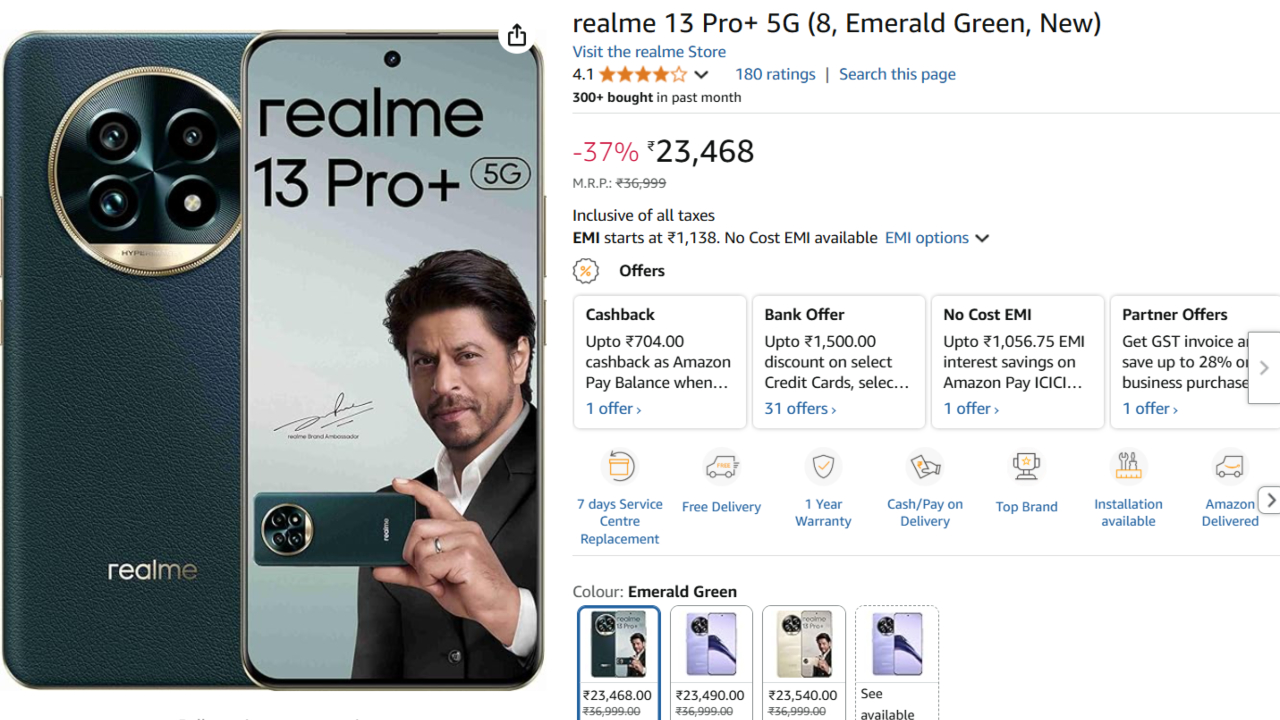 Realme 13 Pro+ 5G, whose price at launch was ₹36,999, now receives a whopping price cut of 37% and is available for purchase at ₹23,375. You also receive no-cost EMI of ₹1,133/month and exchange offer of up to ₹21,800. You can even receive an additional discount of ₹701 when you pay via Amazon Pay or ICICI Bank credit cards, and HDFC Bank credit cards offer an additional discount of ₹1,500.