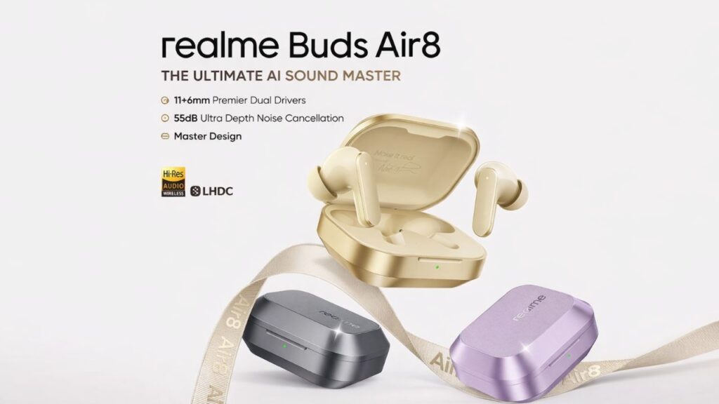 Realme Buds Air 8 may feature a dual-driver setup with an 11mm driver paired with a 6mm driver. It will also get up to 55dB ultra-deep active noise cancellation and Hi-Res Audio Wireless certification.