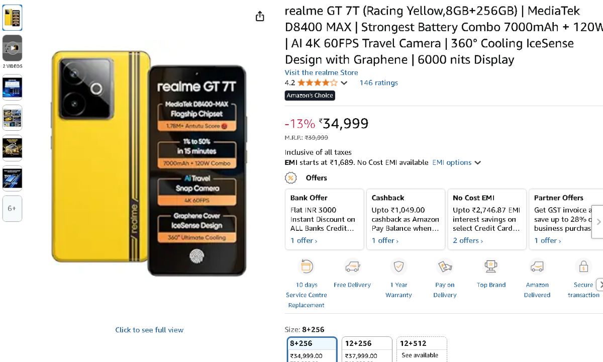 The 256GB edition of this Realme handset is priced at Rs 34,999 upon launch. Looking at the listing right now, we can see that this phone is available for the same price. However, when using a credit card from any bank over the phone, a Rs 3,000 instant discount is offered. Following this, the phone’s price drops to just Rs 31,999. However, there is a time limit on this discount offer. This deal is only available to you for a limited time. The phone can be purchased once more at the same price.