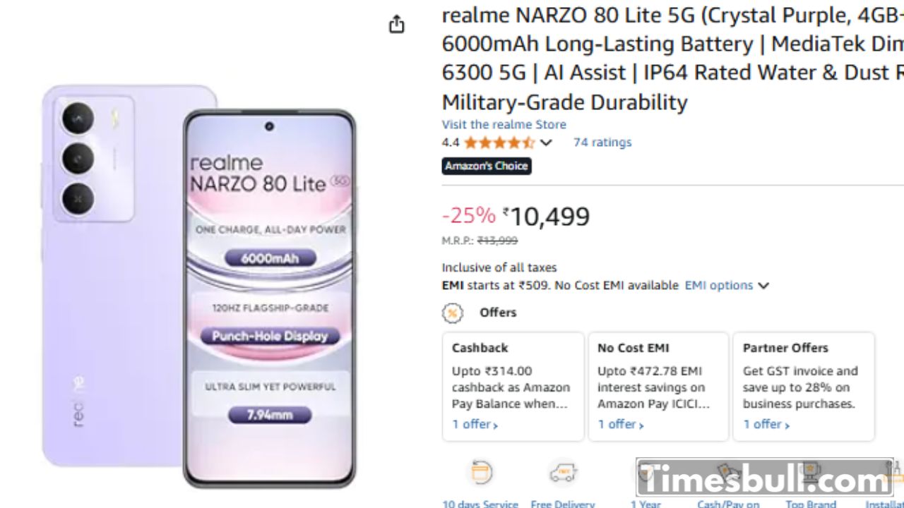 The original price of Realme Narzo 80 Lite 5G is ₹ 13,999, but right now it is getting a straight 25% discount on Amazon. That is, you can buy it for only ₹ 10,499. Getting such a powerful smartphone at such a low price is really a great deal, especially for those who want to buy a 5G phone for the first time or are looking for a secondary phone.