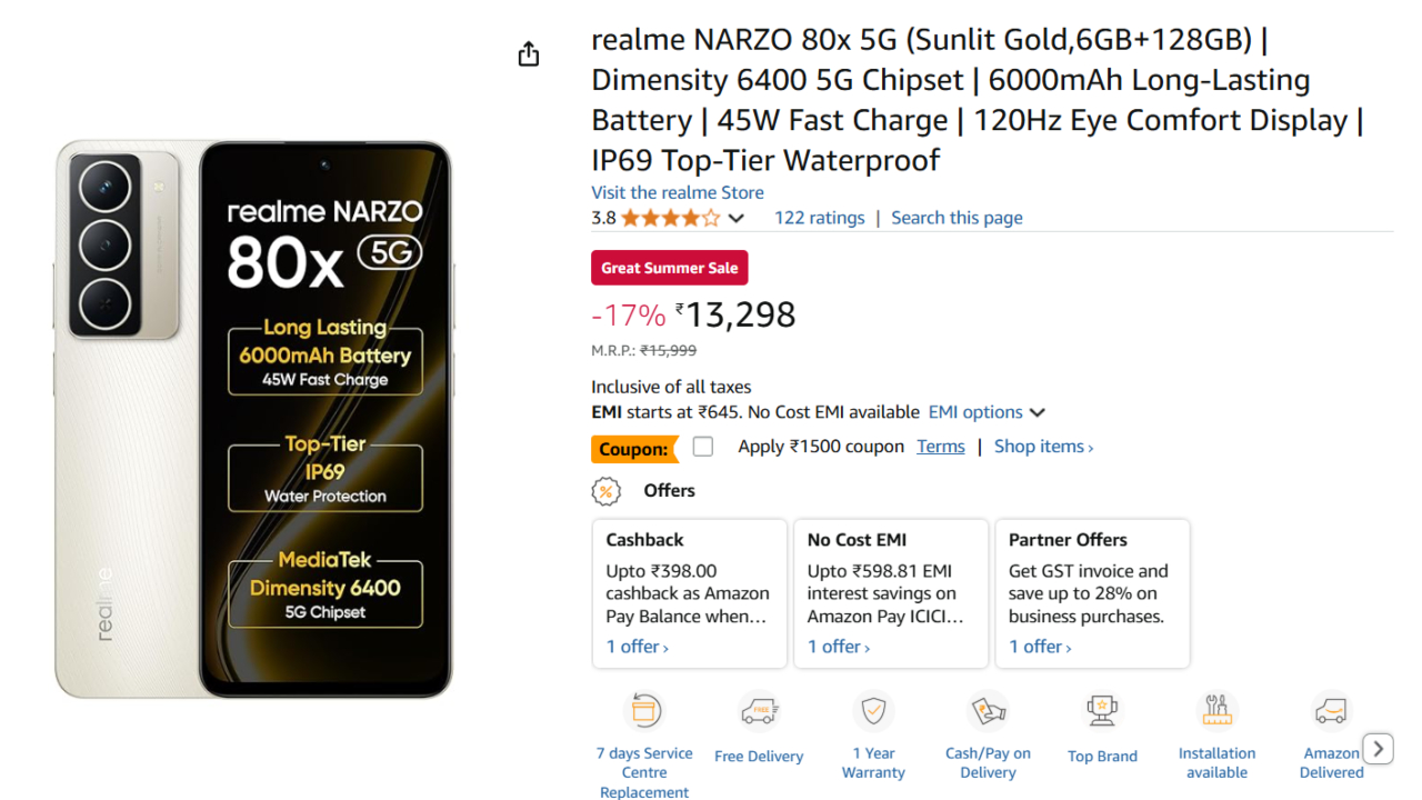 Realme Narzo 80x 5G Sale : If you have long been thinking of getting a new phone, today might be the best day. Amazon Summer Session Sale is ending today, 8 May 2025. And Realme Narzo 80x 5G is now available with a fantastic price cut especially for this sale. It was previously priced at ₹15,999, but now it can be bought at just ₹13,298. That’s an awesome discount on a feature-packed 5G phone.