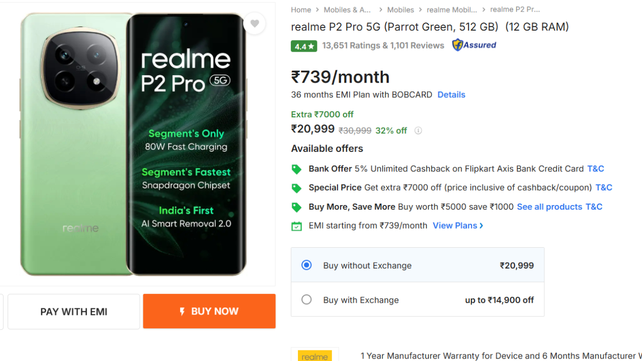 Realme P2 Pro 5G Flipkart Deal : If you were waiting to purchase a long-lasting phone with a new look and sharp features, then it could be your turn. Flipkart is now offering a huge discount on the realme P2 Pro 5G. The phone was previously available at the discounted price of ₹30,999. But now you can purchase it at ₹20,999. That is a staggering ₹10,000 less, a 32% off.