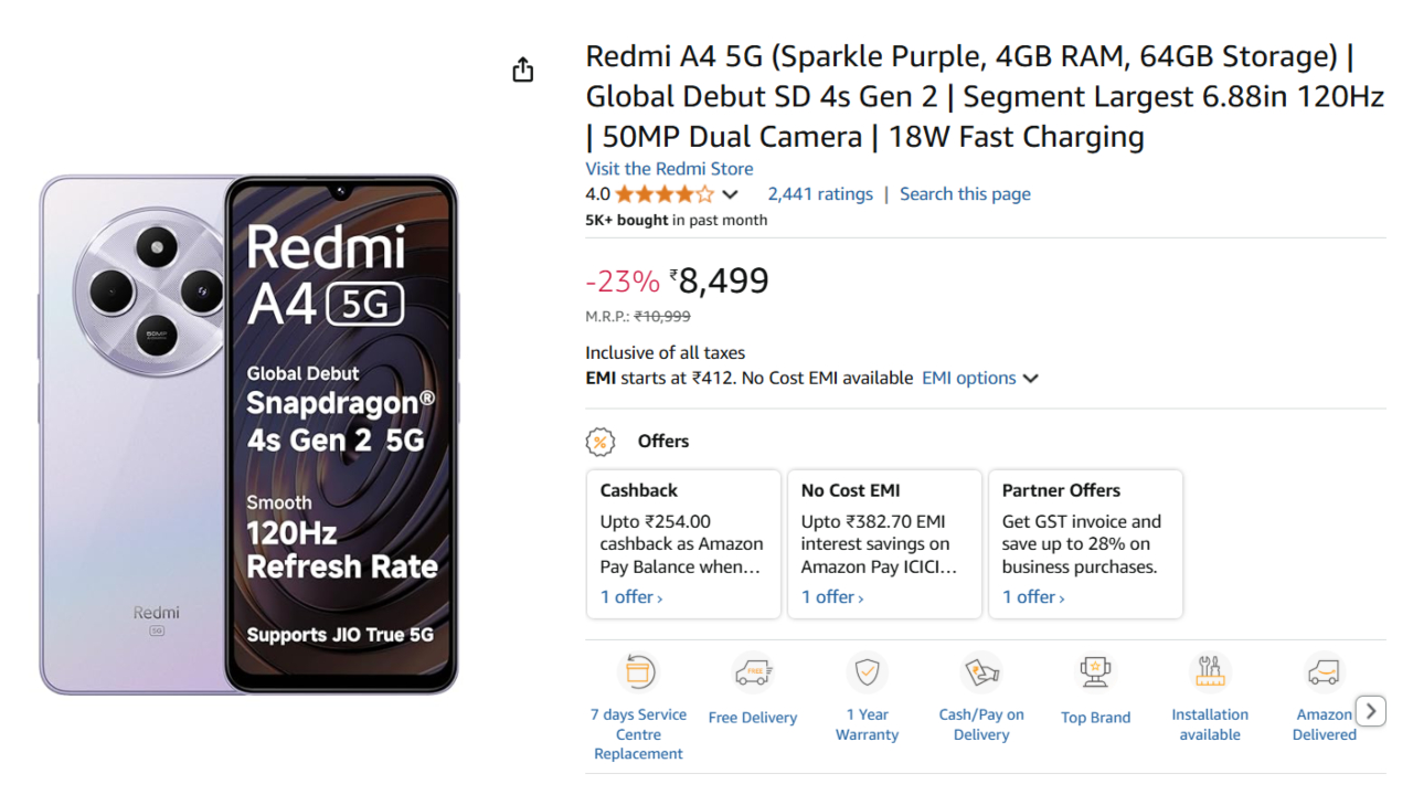 The Redmi A4 5G is now available at an unbelievable price. Originally priced at Rs. 10,999, you can grab it for just Rs. 8,499, saving a massive 23%. But that’s not all. You can take advantage of a No Cost EMI plan to make it even easier on your wallet.