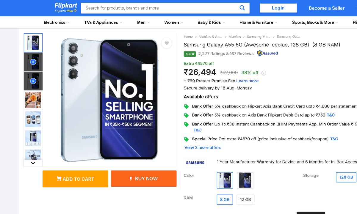 At Rs 39,999, Samsung launched the Galaxy A55 5G smartphone model, which has 128GB of storage and 8GB of RAM. Flipkart is now selling this Samsung phone for Rs 13516 less. Its price went down to Rs 26,483 with this mark down.