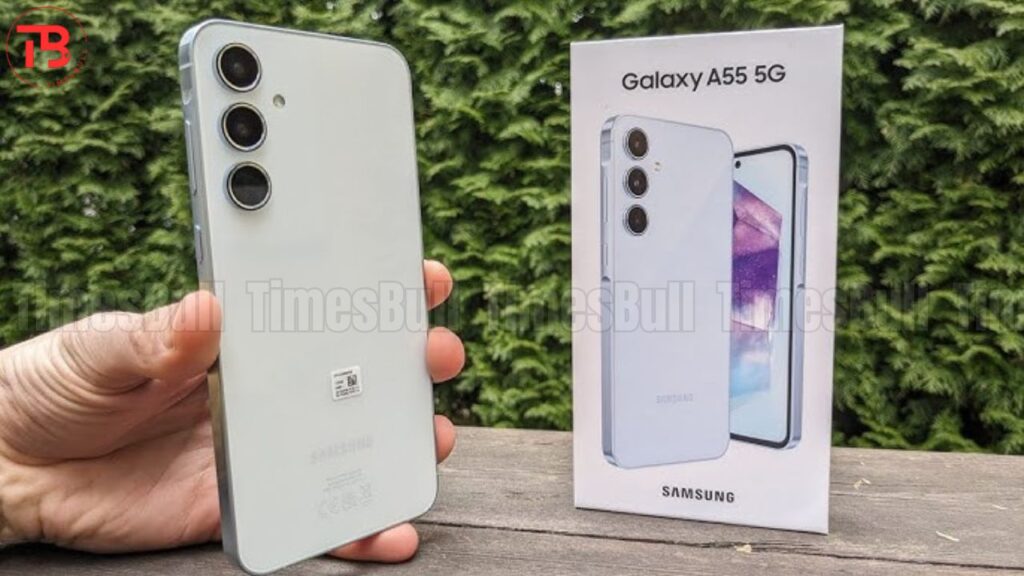 When we look at features of Samsung Galaxy A55 5G phone, then it comes with Exynos 1480 processor, and it gives very good performance for multitasking and gaming. The phone is equipped with a 6.6-inch FHD+ Super AMOLED display, and you get a very smooth 120 Hz refresh rate and up to 1000 nits peak brightness from this phone. This display provides a very good viewing experience, and in rear section you get 50MP main sensor with OIS, 12MP ultra-wide camera, 5MP macro camera, and 5MP depth sensor. The phone is equipped with 5000 mAh long-lasting battery pack, and you also get 25W fast charging support. The phone runs on Android 14 and promises 4 major Android upgrades.