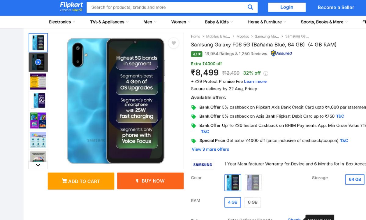 Samsung Galaxy F06 5G: Starting at Rs 8499, Samsung’s Galaxy F06 5G is now heavily discounted on Flipkart. This 5G phone features a 50MP camera and a 5000mAh battery. This phone becomes even more inexpensive with bank discounts and free EMI. Features of this phone include a 6.7-inch HD+ display, 4GB RAM, and 64GB storage.