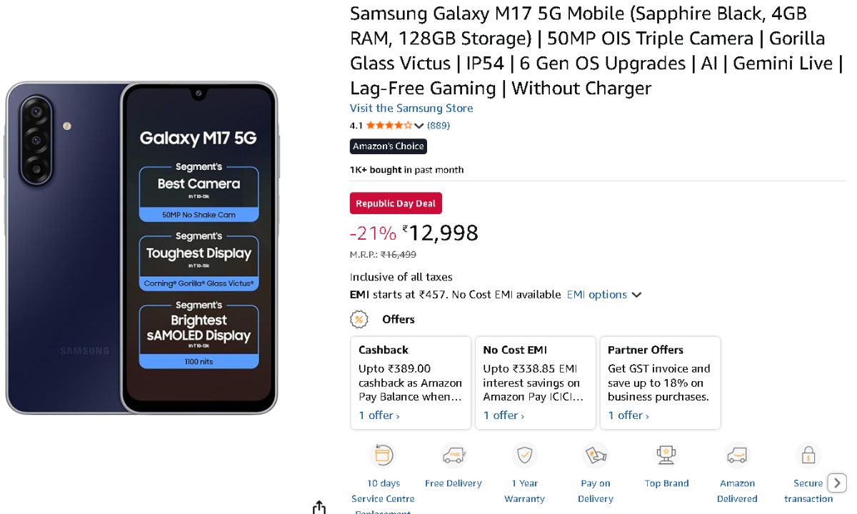 Amazon has a fantastic deal on the Samsung Galaxy M17 5G. Instead of the phone’s MRP of Rs. 16,499, customers can now purchase it for Rs. 12,998. This cost applies to the 4GB + 128GB model. There are also a number of bank offers. Additionally, those who exchange their old phones can receive a discount of up to Rs. 12,300. However, the phone’s condition will determine the real exchange value. There are additional alternatives for EMI.