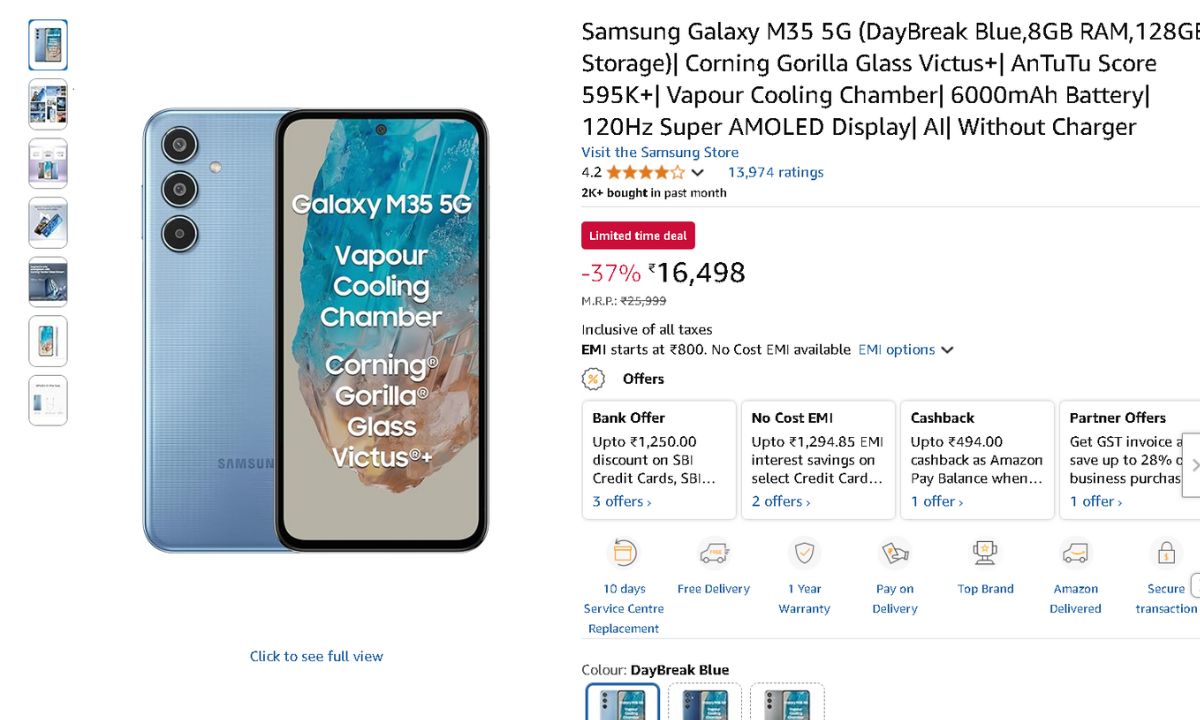 The Samsung Galaxy M35 5G may be a good choice for you if you are looking to buy a new phone for around Rs 15,000. The best part is that, even before the Amazon Great Indian Festival Sale, you may purchase this phone at a steep price. This Samsung phone is now available as part of Amazon’s Great Indian Festival early savings. The phone model with 128 GB of internal storage and 8 GB of RAM cost Rs 21499. This phone is now priced at Rs 16498 on Amazon India.