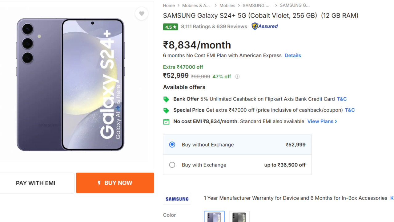 Samsung Galaxy S24+ 5G : You are going to buy a luxury phone, and if that is the case, then Samsung Galaxy S24+ 5G is your perfect phone. The phone is priced at ₹99,999, but now it’s available on Flipkart at a discounted price of ₹52,699. That’s 47% off.