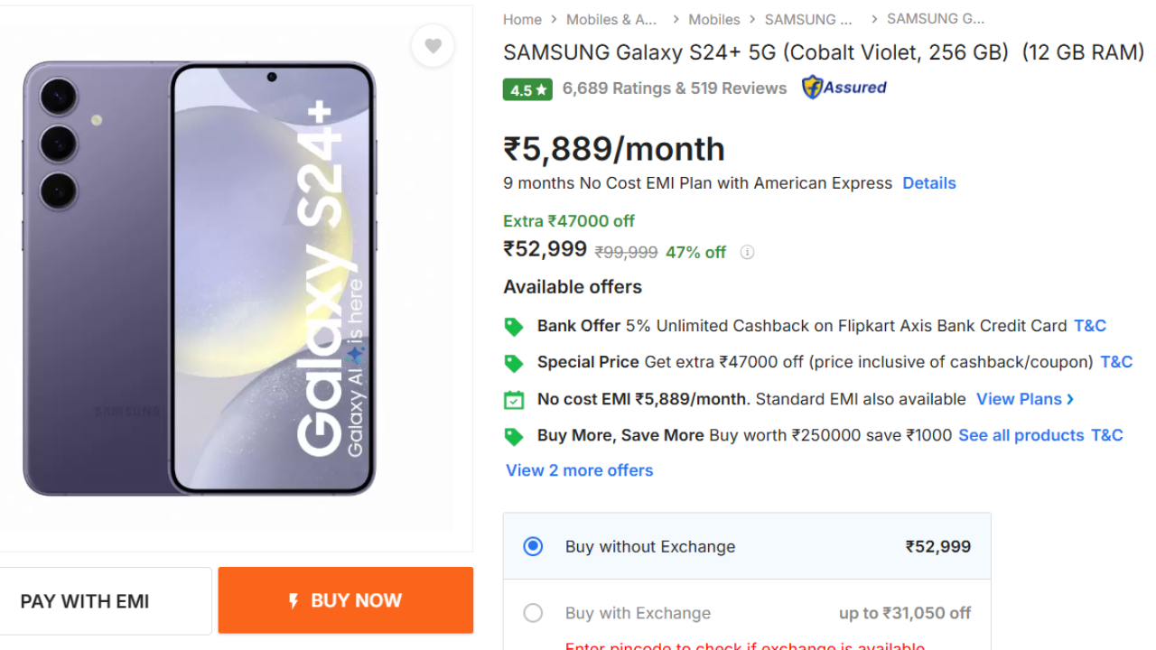 There is another good news for customers who want to buy a phone on EMI. No Cost EMI option is also available on this device on Flipkart, starting from just Rs 5,899 per month. This means that you can make Galaxy S24+ yours in easy installments without any interest.