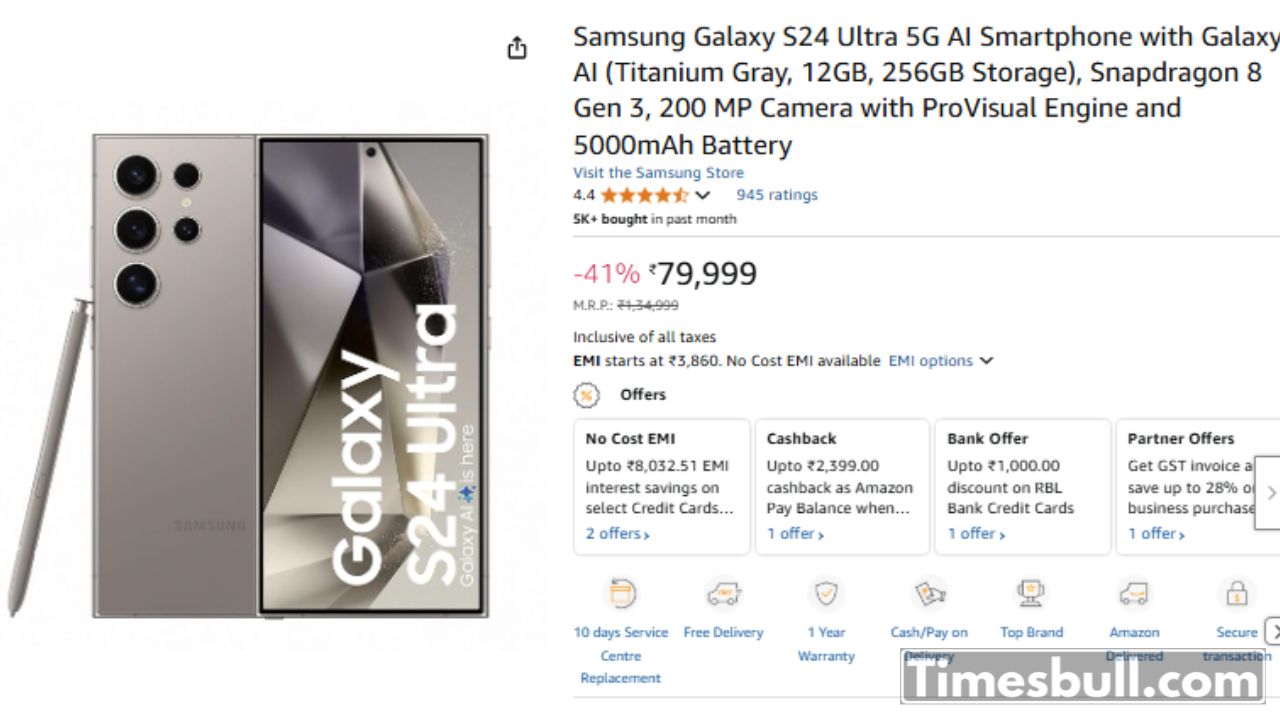 Currently Samsung Galaxy S24 Ultra 5G AI Smartphone, which comes in classy Titanium Gray color, with 12GB RAM and 256GB storage, is available for just ₹ 79,999. Yes, earlier its M.R.P. It was ₹1,34,999, but now it has a solid 41% discount. Getting such a big price cut on such a flagship is not a daily affair, so if you want to buy a top-class phone, now is the perfect time.