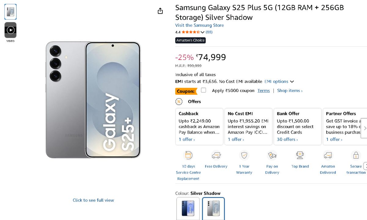 The original price of this Samsung phone was ₹84,999. There has been a ₹10,000 price reduction. The starting price of the Samsung Galaxy S25+ is ₹74,999 on Amazon. A ₹5,000 coupon discount is also available on the phone from Amazon. A ₹1,500 discount is offered by the bank, saving ₹16,500 in total. Samsung’s flagship phone will retail at Rs 67,499.