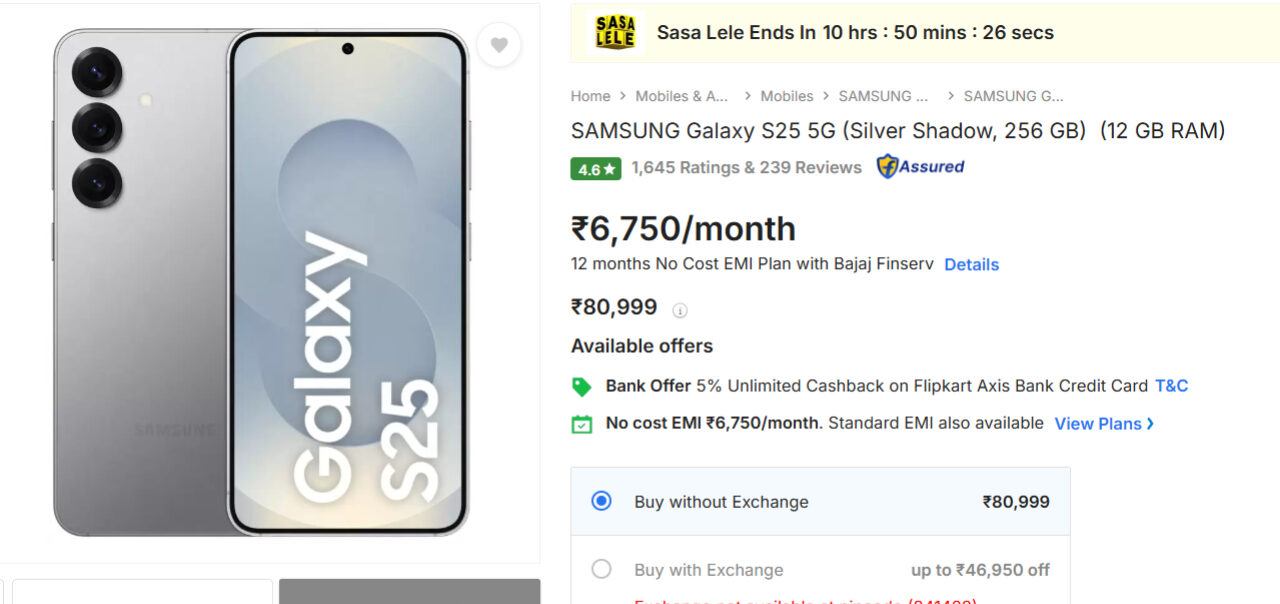 The cost of Samsung Galaxy S25 5G is ₹80,999. But Flipkart gave a good shopping experience. No cost EMI is available, i.e., you don’t have to give them the money at once. You can do it step by step in monthly installments without any extra charge.