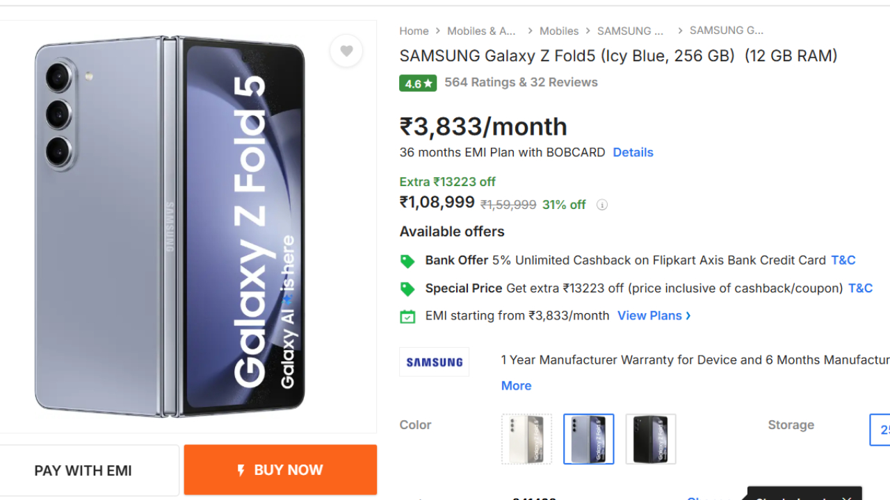 Samsung Galaxy Z Fold 5 retailed at Rs 1,59,999. But now it is available to purchase on Flipkart for Rs 1,08,999 only. That is a discount of Rs 51,000 immediately. This is a straight discount of 31 percent, and things like that don’t usually occur for such a costly foldable phone.