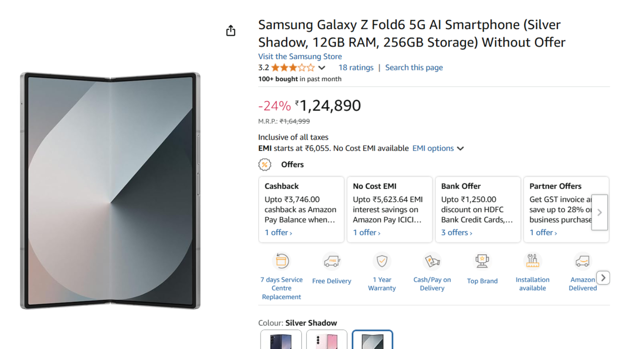 The price of Samsung Galaxy Z Fold6 5G is ₹1,64,999. But now that it can be found on Amazon, it can be bought for as low as ₹1,24,890. That is only 24 percent lesser. It is as bizarre a trim as anyone will ever get off of so costly of a phone. The icing on the cake, Amazon is offering a no-charges EMI as well. So if you wouldn’t mind paying the amount in installments at once, you can pay the easy monthly instalment without any additional interest being charged. This is also making it even more cost-effective to purchase this foldable flagship phone.