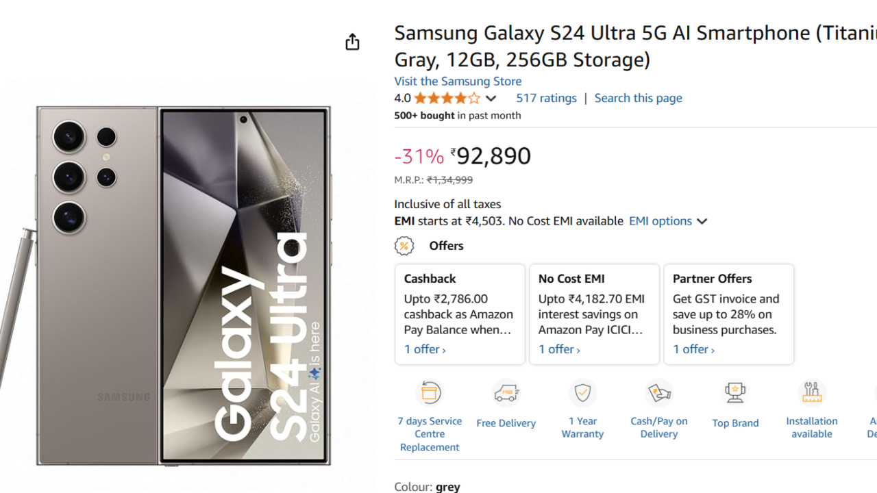 The original price of Samsung Galaxy S24 Ultra 5G is Rs 1,34,999 but currently it is available on Amazon for just Rs 92,890. An additional discount of Rs 2,786 is also being given on payment through Amazon Pay ICICI credit card.