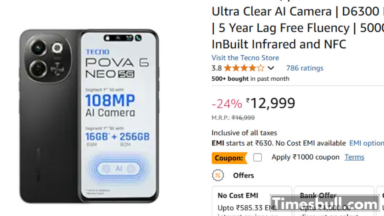 Although the actual price of Tecno Pova 6 Neo 5G is ₹ 14,999, but many types of offers are going on on Amazon. A coupon discount of ₹ 1000 is available, along with this, if you have a bank card like Axis, ICICI or IDFC, then you will also get an instant bank discount of ₹ 750. Combining both, this phone can come in your hands for ₹ 11,249. And if you exchange the old phone, then you can also get an additional discount of up to ₹ 10,000, which makes this deal even more amazing.
