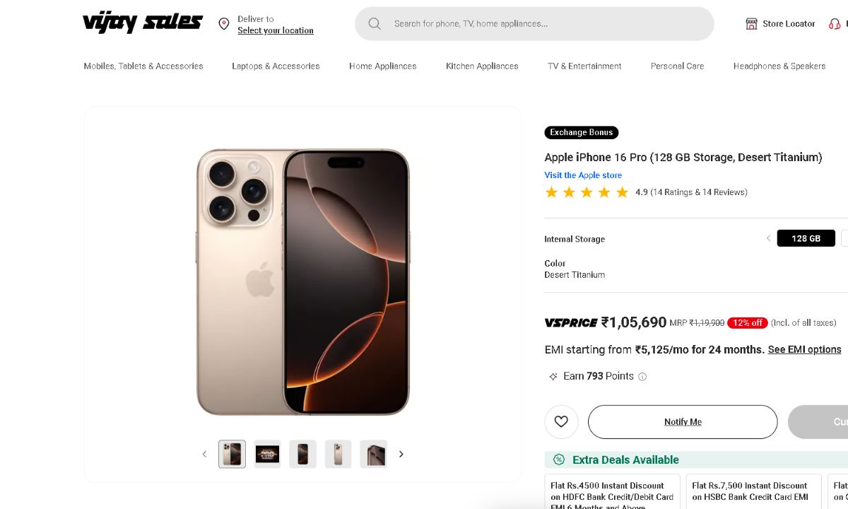 Vijaysales’ official website now offers the iPhone 16 Pro for Rs 14,210 less. The initial pricing of the phone is Rs 1,05,690. The cost of the handset’s 128GB storage version is Rs 1,19,900. Discounts are being offered over the phone in addition to the price reduction. You will receive an instant discount when you pay using a certain bank’s card.