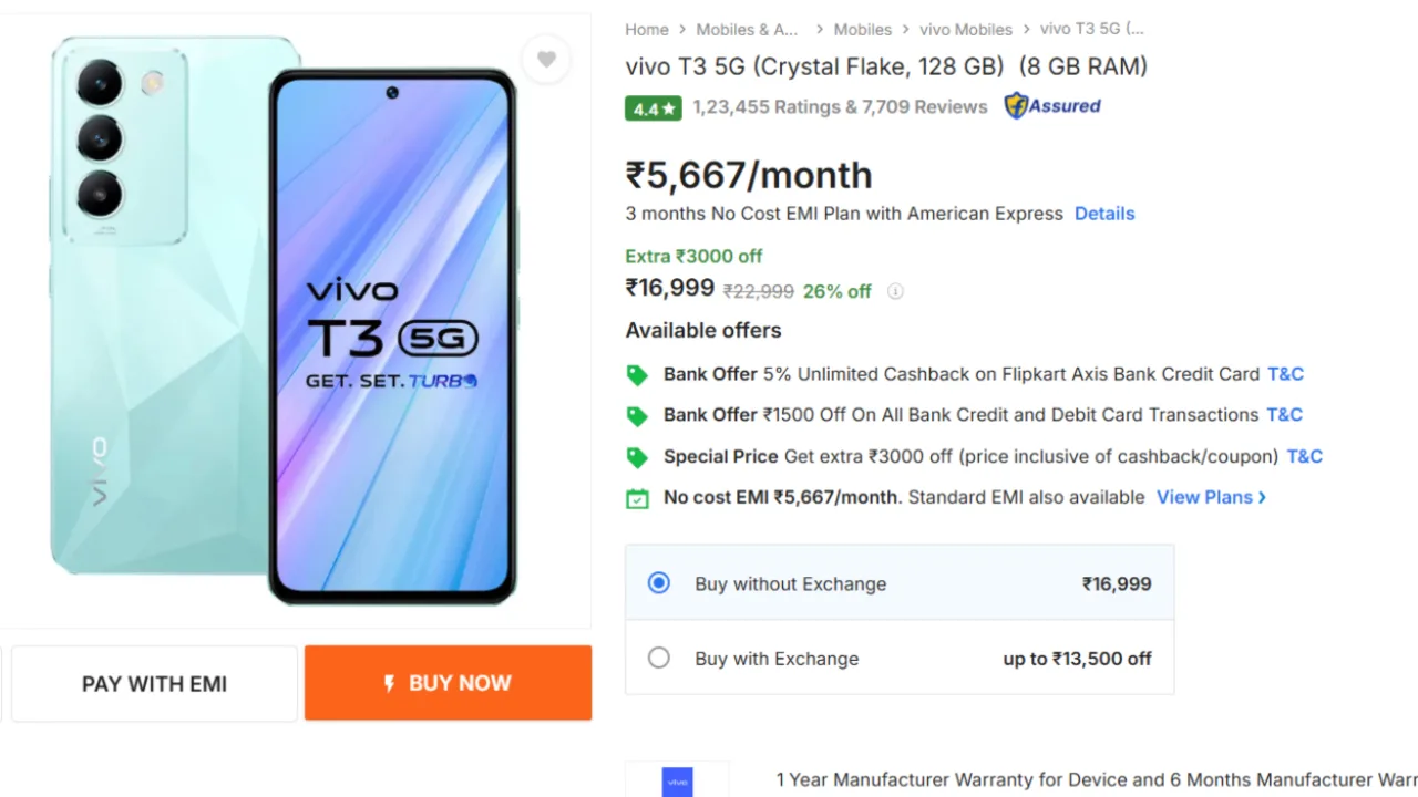 The Vivo T3 5G previously cost ₹22,999. Today, it is available for just ₹16,999 on Flipkart. That is a discount of 26%. No cost EMI is also available, so you pay in installments in small quantities without shelling out any extra amount. Besides that, there is a flat discount of ₹1,500 on every bank credit and debit card. And if you trade-in your current phone, you can avail the maximum off of ₹15,300.