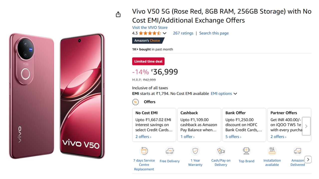 Vivo V50 5G Discount : If you were waiting to buy a new 5G phone, then now is the time. Vivo V50 5G is already listed on Amazon at a huge price drop and some discount too. The phone was initially priced at Rs 42,999. But now you can buy it for Rs 36,999. That’s a flat discount of Rs 6,000. It is 14% off which is certainly a big deal for a phone of this grandeur.