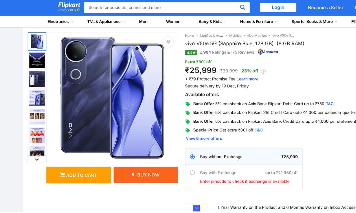Flipkart has the Vivo V50e 5G model with 8GB RAM and 128GB storage for ₹33,999. The effective price is reduced to ₹26,999 during the sale, nevertheless, with a discount of about 21%.
