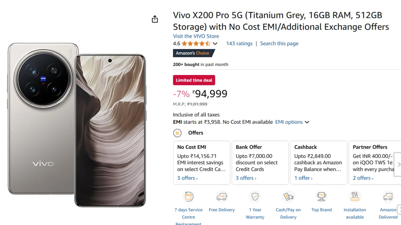 The Vivo X200 Pro 5G is actually worth ₹1,01,999, but currently, it is available for only ₹94,999. It also has a 7 percent discount. It gives an option of no-cost EMI too. Now, one can pay the price in easy installments, each without any interest. Easy on the pocket, right?