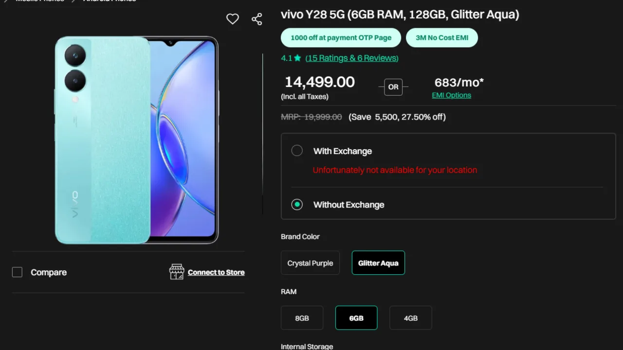 The price listed for the Vivo Y28 5G was ₹19,999. Right now, Croma has this unbelievable offer of 27% discount, bringing the price down to just ₹14,499. That truly is a great bargain for an awesome 5G phone with rare features.